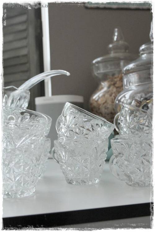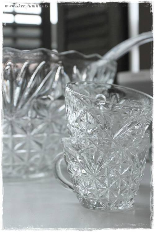 Um daginn, þá keypti ég púns-skál með fullt af glösum.  Einmitt, af því að ég er svo mikil drykkjukona!  En bæði skálin og glösin voru fögur og það gladdi mig og fékk því að koma með heim.  Það þarf náttúrulega alltaf að vera að bjarga einhverju með heim…