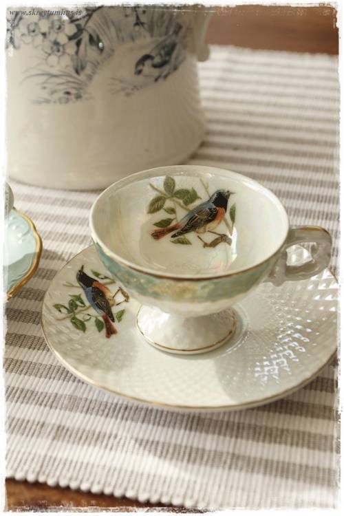 …og endulega gefið ykkur tíma í að horfa á hversu fallegir þessir litlu bollar eru. Alls ekki samstæðir og hvor úr sinni áttinni. En það er hluti af sjarmanum á bakvið þá – finnst mér. Þessi er með fallegum fugli, bæði inni í bollanum og svo á undirskálinni.