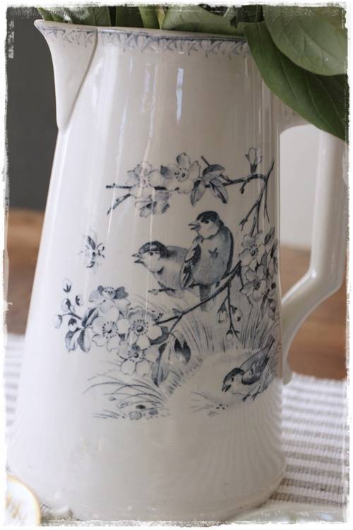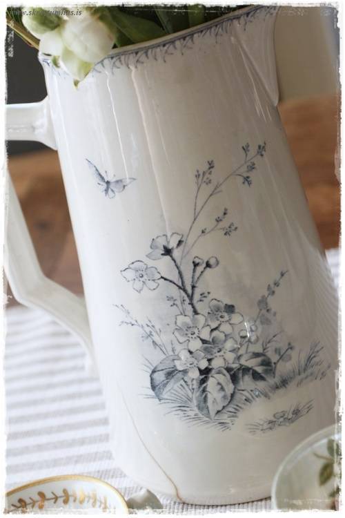 Eins og áður hefur sést, þá fékk þessi gamla kanna að fylgja mér. Hún er bara svo ansi hreint falleg að mínu mati. Hvít og blá, mjög danskt eitthvað, og auðvitað fuglar á henni…
