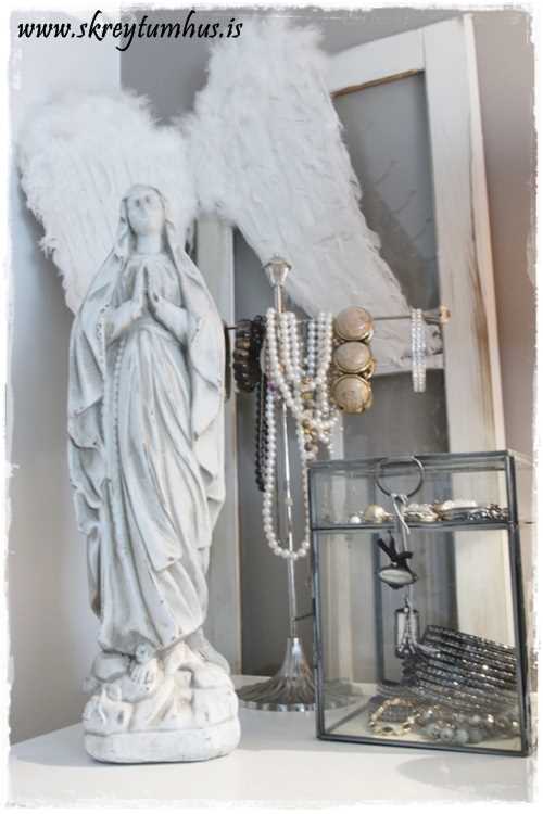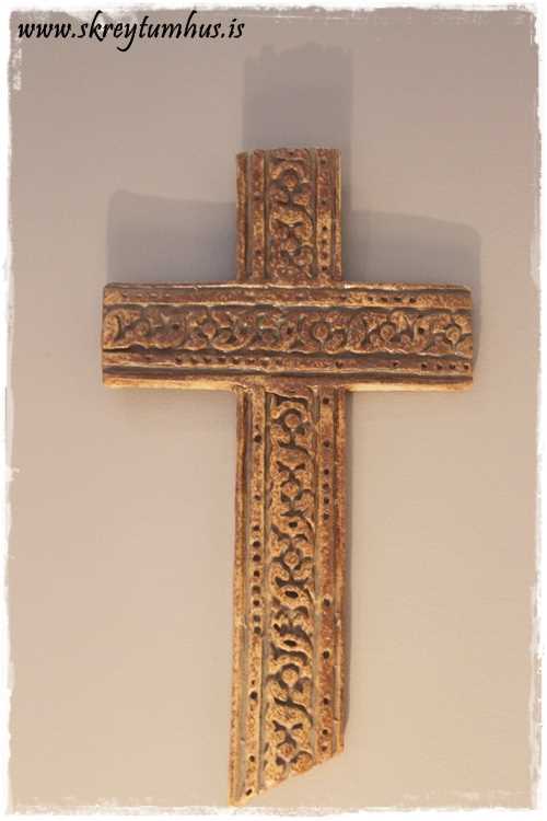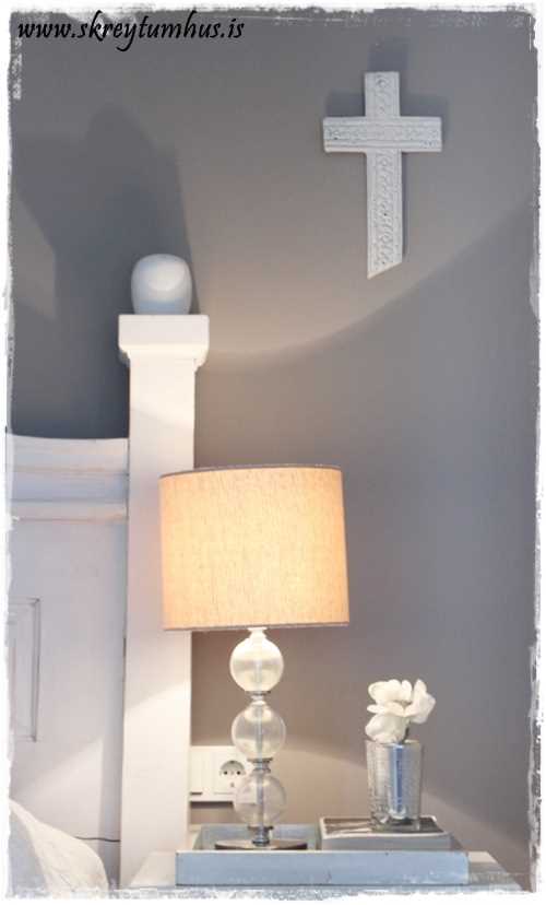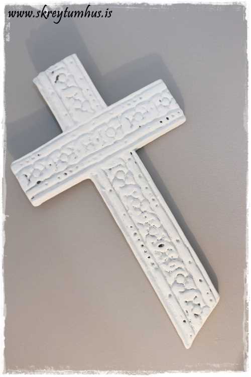 …krossinn sem á vegginum hangir er í miklu uppáhaldi, en mér fannst hann hverfa svolítið inn í vegginn.  Hins vegar mundi ég eftir orðum Eurovísjón-dívunnar um að hún málaði Goggana sína með kalkmálningu og að það væri hægt að þvo hana af.  Þannig að ég ákvað bara að kalka blessaðann krossinn…