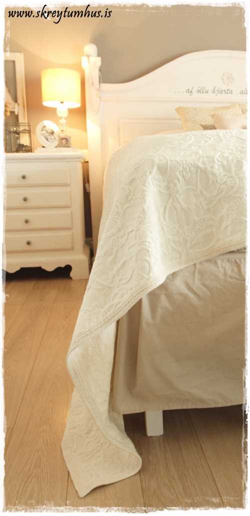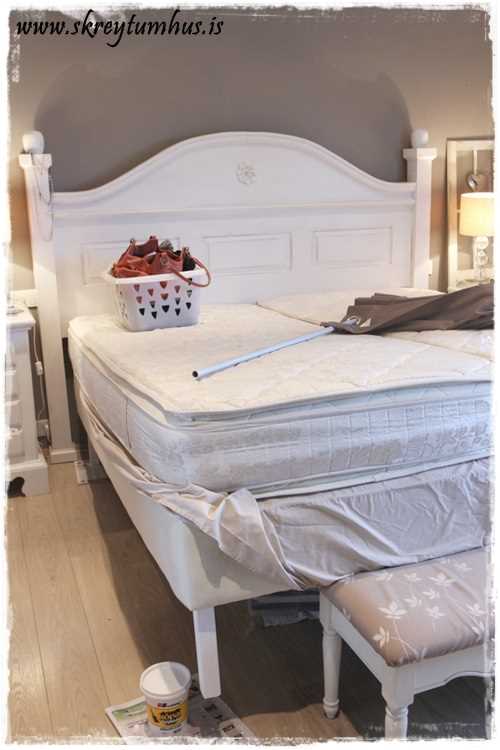 …þannig að rúminu var lyft á upp á bekkinn og lappirnar málaðar hvítar með hvítum Kópal grunni, einfalt og easy, tók enda stund.  Endilega gefið ykkur tíma til þess að dáðst að þvottakörfunni á rúminu, gömlu gardínustönginni og öllum þessum fínheitum ;)…