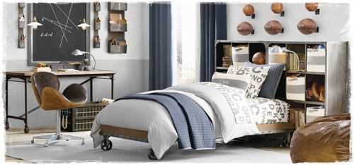 …þarna sést ferlega flott rúm á hjólum og hillan er í raun rúmgaflinn, þarna væri t.d. hægt að nýta Expedit-hillu frá Ikea sem “höfðagafl”…