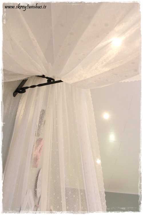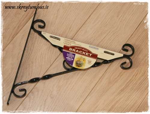 …tvær blúndugardínur úr Ikea saumaður, eða bara festar saman með nælum og lagðar yfir svona típískt útipottablómahengi. Þetta er frá Blómavali og kostaði eitthvað undir 800kr…