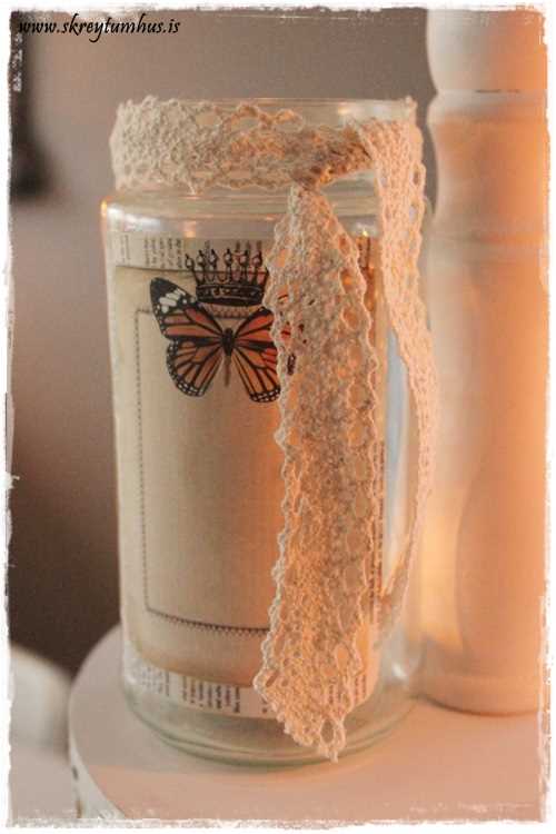 …pappírinn utan um þessa er í raun umbúðir/bakgrunnur af blúndulímrenningum úr Skrapp og Gaman, sem bara sýnir sig að það stundum alveg óþarfi að henda því sem fallegt er, þótt það séu bara umbúðir.  Ég tók síðan hvíta snærið og setti líka utan með krukkunni, fyrst bara til að halda á meðan límið festi sig, en fannst það svo bara fínt og leyfði því að vera…