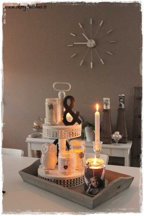 …þarna sjáið þið að í efstu krukkunni er skrapppappírinn tvöfaldur, þannig að það kemur líka fallegt mynstur innan í krukkunni.  Glæri stjakinn er fundur úr þeim Góða Hirði…