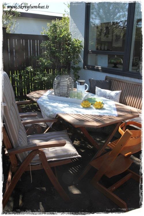 …bakkinn var keyptur í Ilva seinasta sumar, en það er eitt sem maður lærir af reynslunni (eða bara ef maður hugsar dæmið til enda) og það er hafa trébakka á borðin utandyra á Íslandi, þýðir bara að þú kemur að bakkanum, oftar en einu sinni fullum af vatni – obbbobbbobb…
