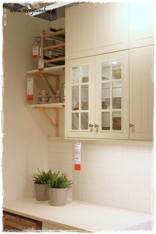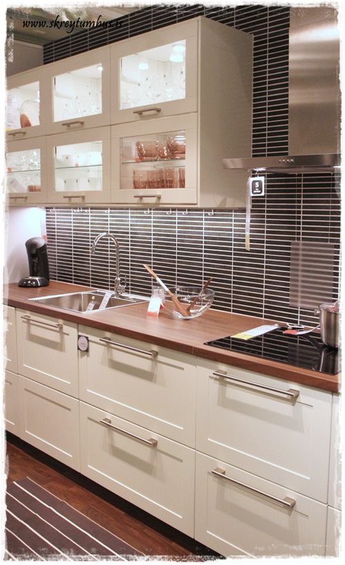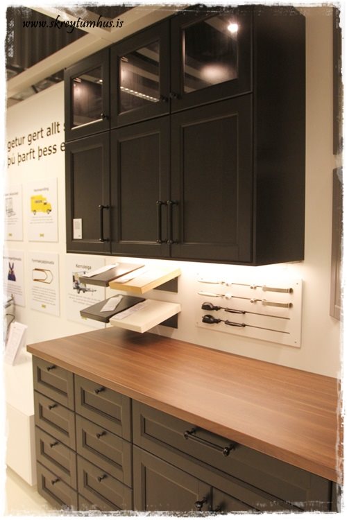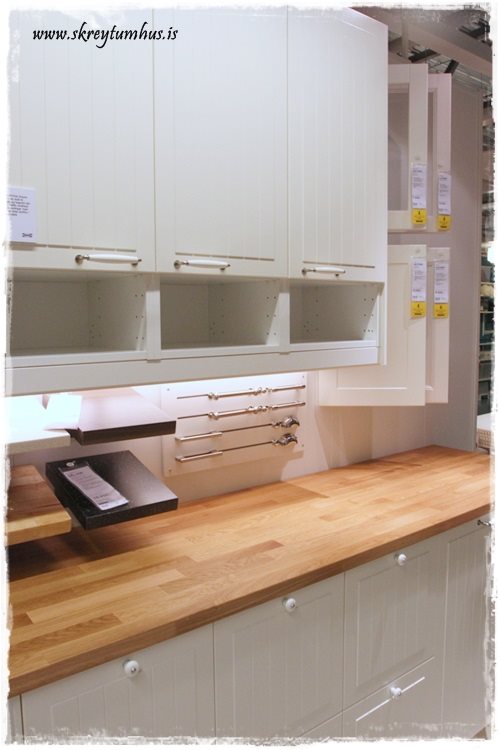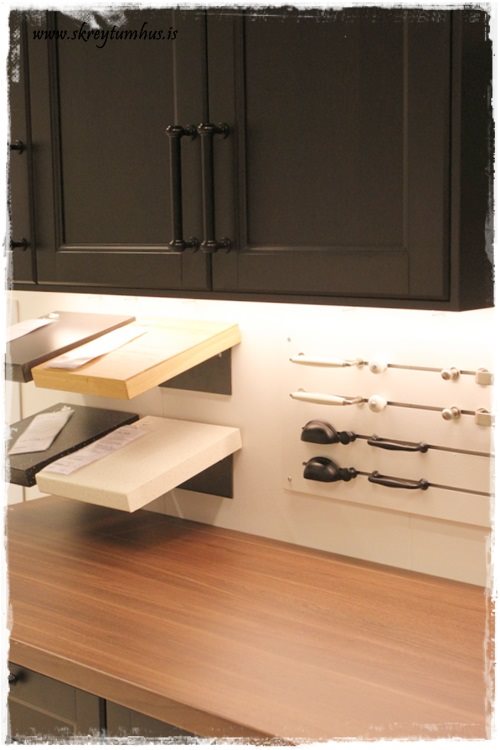 …búið er að setja upp frábært rými með eldhústýpunum, ásamt því sem að passar sérstaklega vel með þeim.  T.d. þessi hér sem er í miklu uppáhaldi hjá mér, er sýnd hér með viðarborðplötu og svörtum húnum, en svo er líka sýndar fleiri borðplötu möguleikar og húnar, bara sniðugt…