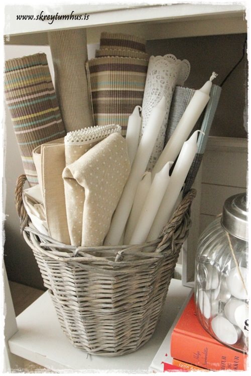 …karfa inni í eldhús sem geymir löbera, dúka og stöku kerti…