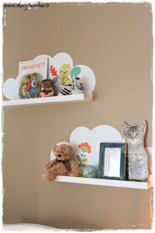 …húsmóðirin átti fyrir tvær hvítar Ribba hillur, og þar sem að skýjin sem ég gerði inn hjá litla manninum eru enn skemmtileg hugmynd. Þá ákvað ég að gera líka ský þarna, nema að ég fékk húsbóndann, sem vinnur hjá fyrirtæki sem heitir Signa og gerir límmiða, til þess að útbúa límmiða-filmu á bakvið hillurnar. Einfaldari útfærsla en hillurnar sem að við útbjuggum, en gera það sama…