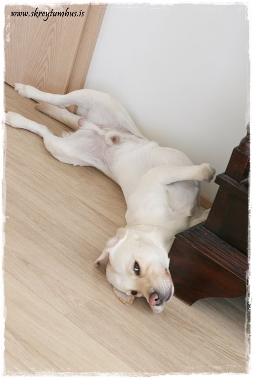 …svona getur hann Stormur okkar legið þegar að hann leggur sig, kreisí dog…