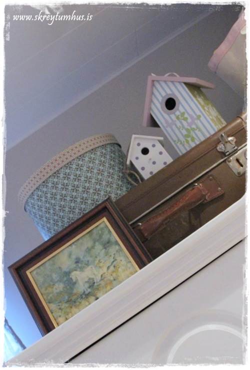 …uppi á skáp eru pokar fyrir bangsa, en við hliðina á skápnum sjáið þið töskur – og þegar ekki er búið um rúmið þá geymi ég púða þar…