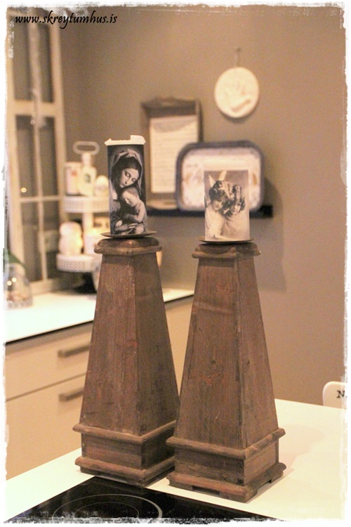 …en þar sem að ég setti hlunkana mína tvo (kertastjakana) á eyjuna líka, þá fannst mér þetta verða einum of sko! Einum of hvað? Einum of mikið, eða sem sé tvisvar sinnum tveimur of mikið. Sér í lagi þar sem að báðir turnarnir eru næstum í sömu hæð…