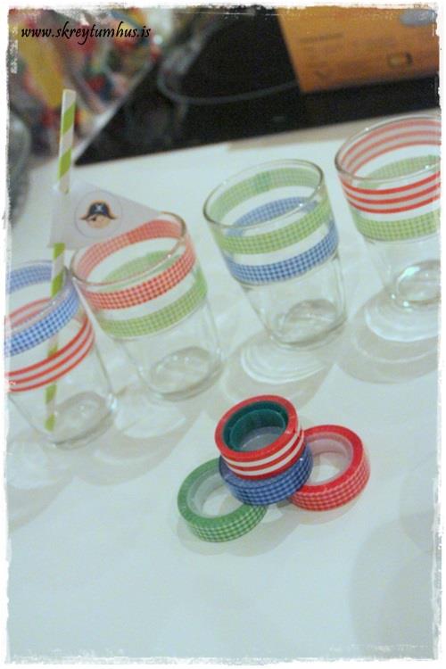 Því eins og sagði í seinasta pósti þá eru REKO glösin frá Ikea alger snilld.  Ég fékk svo sæt teip í Söstrene og í Tiger, og einfaldlega límdi þau utan á glösin.  Rosalega flókið.