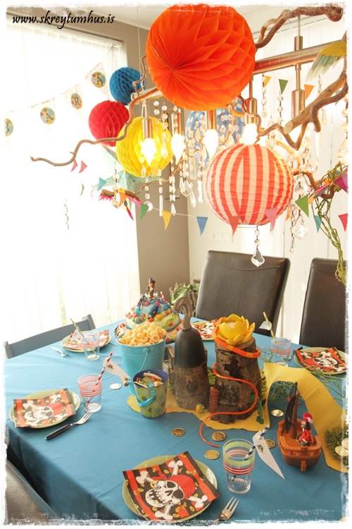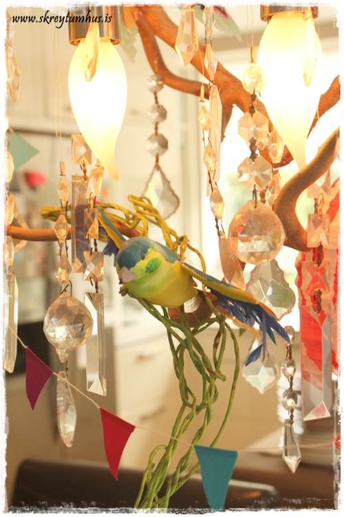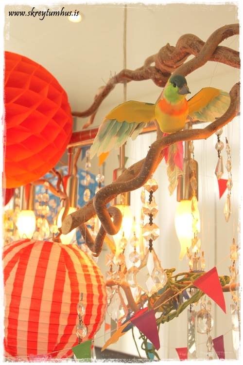 Þar sem að sjóræningjar eru nú oft með páfagauka, þá spilaði ég frjálslega með það og setti skrautlega fugla í ljósakrónuna.  Svona til þess að auka stemmingu…