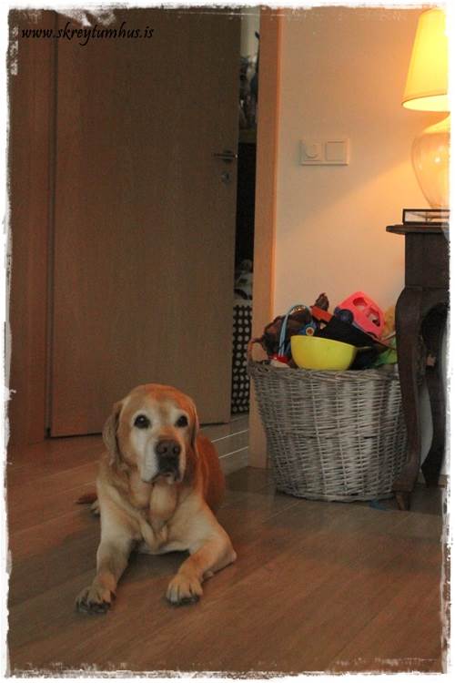 …hér sést gamli, besti minn vera að hvíla sig, en eins sjáið þið dótakörfuna í baksýn. Ég er sem sé ekki ein af þeim sem að passar að það sjáist ekkert í leikföng krakkana. Mér finnst alveg nauðsynlegt að vera með körfu fyrir dótið hans litla manns, því að hann er í því að bera það fram í alrýmið – þá er fínt að geta hent þessu bara í kröfu 🙂