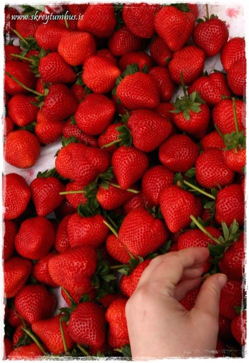 …þessi jarðarber voru svo dásamlegt stór og flott, hendin er sett inn á til samanburðar – og auðvitað þar sem að þetta er Ameríkan, þá var hægt að kaupa súkkulaði með til að dýfa ofan í…