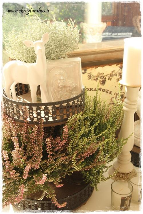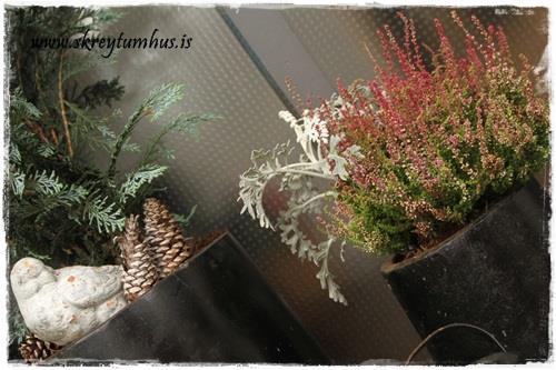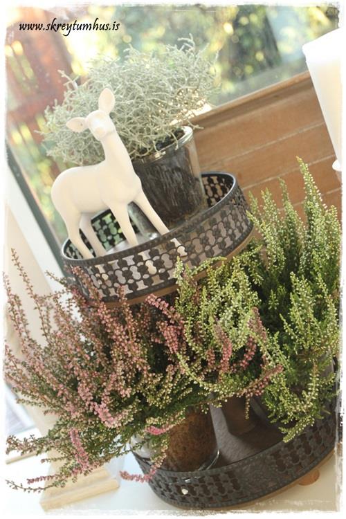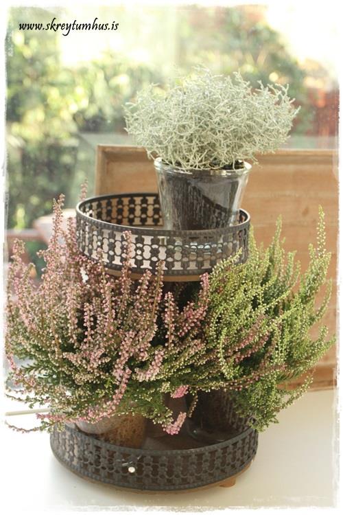 …en ég lét ekki þar við sitja, heldur fékk ég mér líka ericur og vírkamb inn í eldhúsið.  Keypti bara sæta glæra, einfalda potta, tók blómin úr plastpottunum og potaði ofan í, breytti síðan bakkanum góða í haustturn 🙂