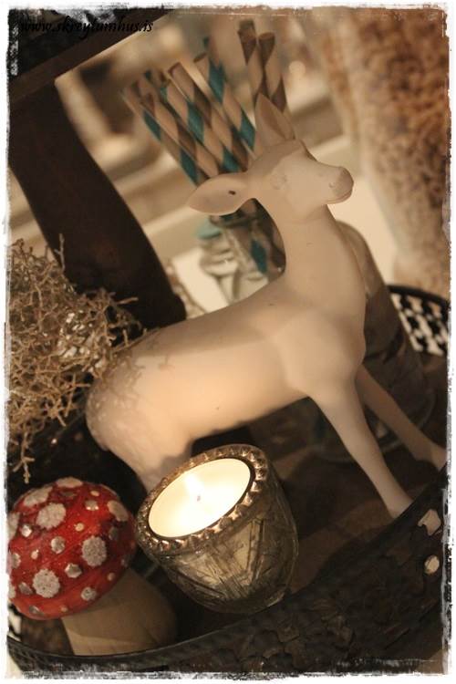 …ég tók bakkann minn góða og hækkaði hann um eina hæð, mín er alltaf á uppleið. Síðan eins og sést, eru litlir sveppir og hreindýr farin að lauma sér inn í dekorinn…