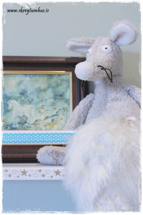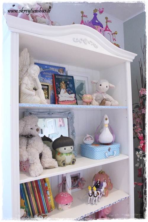 …inni í herberginu hjá dömunni er þessi Bekvam-kryddhilla úr Ikea, sem á sínum tíma var spreyjuð hvít og ég límdi þetta bláa blúnduteip á hana, en núna þá bætti ég við þessu hvíta með gylltu stjörnunum…