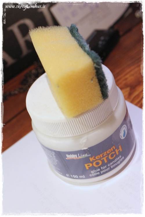 …Ég nota Kerzen Potch til þess að líma pappírinn á (keypti í Föndru), og nota litlu svampana og klippi þá í ca 3 hluta.  Síðan er að setja vel á allt kertið, og strjúka líka yfir bakhlutann á blaðinu.  Eftir að þú ert búin að festa pappírinn á kertið, þá er gott að strjúka nokkrum sinnum yfir pappírinn og kertið með Kerzen Potch…