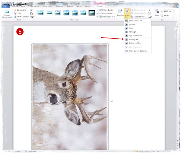 5.  Svo með því að setja þetta í Behind Text, þá geturu dregið myndina alveg út í horn, án þess að hafa spássíður…