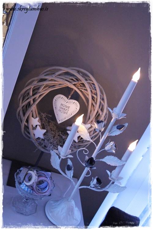 Ótrúlega flott allt saman. Elska þennan krans, þeir fást líka mjög billegir í Rúmfatalagernum bæði hvítir og svona brúngráir, held þeir kosti þar 500 kr ef einhver hefur áhuga 🙂 Líka mjög flott svona vafin hjörtu. Er þessi “ljósastjaki” úr Húsasmiðjunni? Tekur sig mjög vel út. 🙂 🙂
