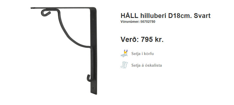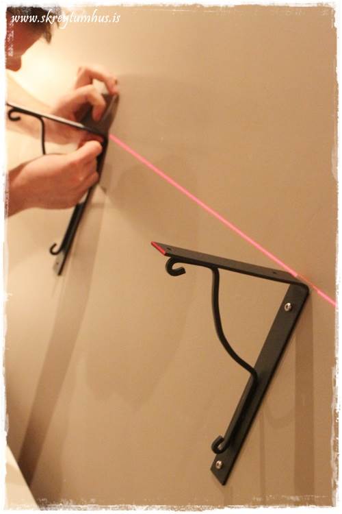 …en gamli skápurinn skyldi fara upp á vegg í þetta sinn.  Ég er búin að vera skíthrædd um að hann detti fram fyrir sig, standandi svona á borðinu.  Þá fór ég í Ikea, og fékk mér hillubera, sem ég var nokk viss um að myndu gefa þessu lookið sem að mig langaði í…