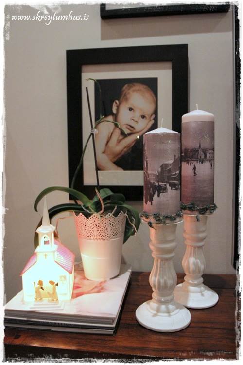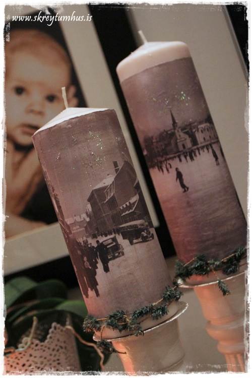 Flottur púðinn! Og sniðug hugmynd að setja svona gamlar myndir á kerti og skemmir ekki fyrir að hafa þær frá rvk…ekki bara vintage sem finnst á netinu, svona útlenskt ;o) Hér er allt að verða jólalegra með hverjum deginum og ótrúlega lítið stress í fólki.