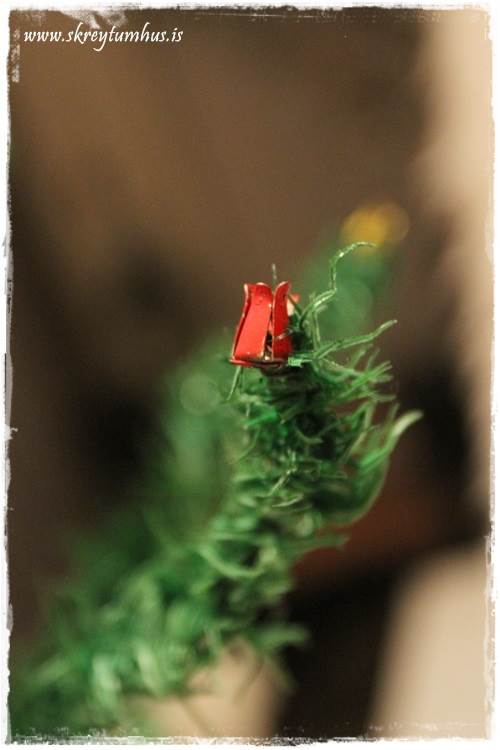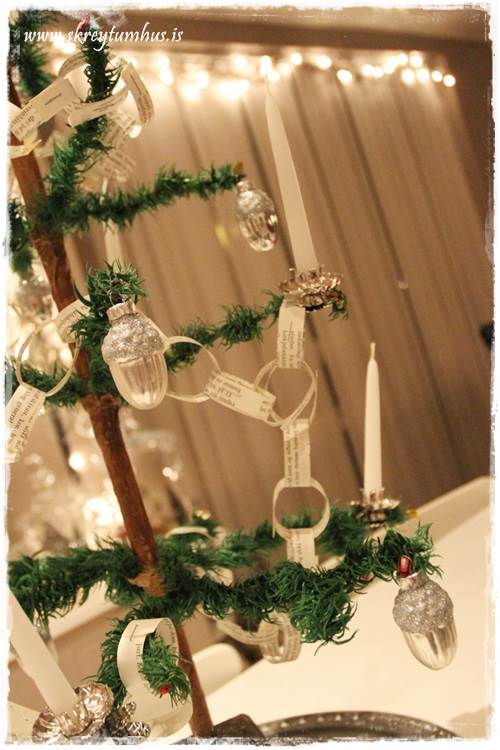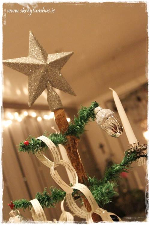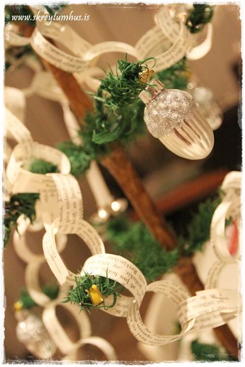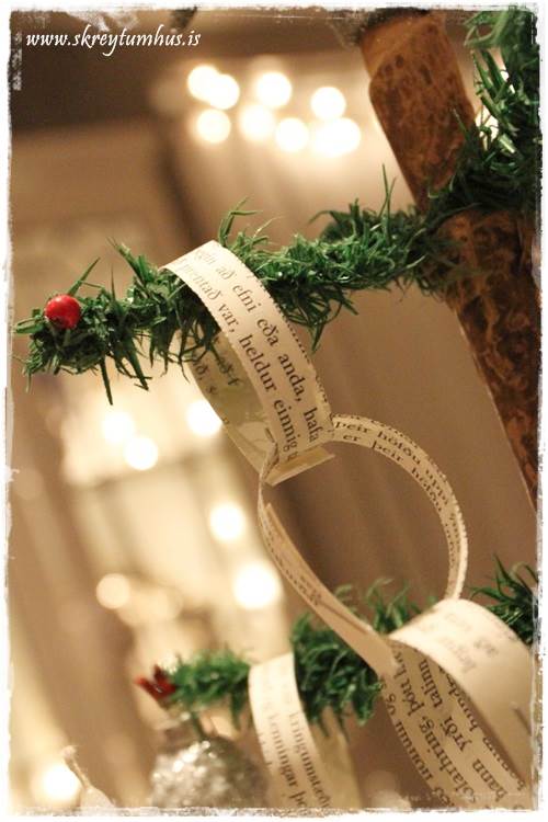…þannig að ég klippi blaðsíður úr gamalli bók í einfalda renninga og heftaði saman, og útbjó svona “garland” á tréð – svona enn og aftur, nettur nostalgíufílingur í þessu…