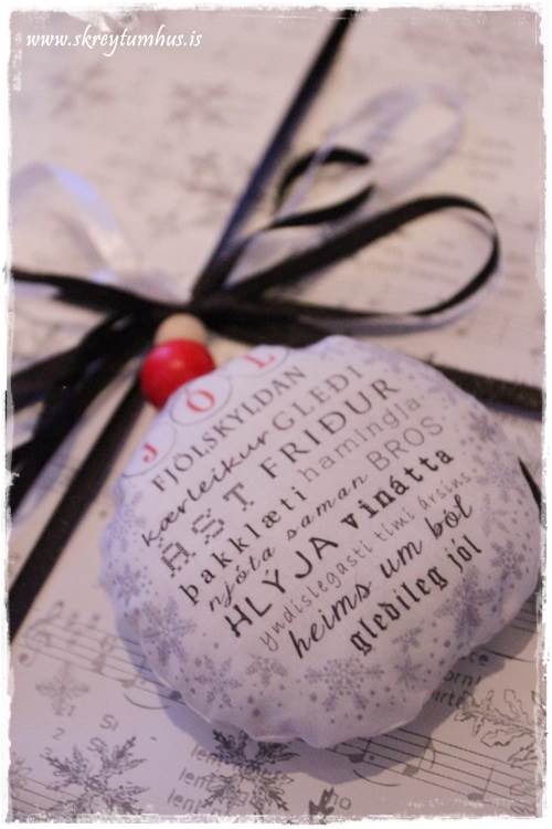 …en mér fannst æðislegt að gefa honum svona Jólapúða, frá Kærleikspúðum Dísu, á pakkann sinn (ekki það að hann muni það eitthvað sérstaklega þessi elska, en ég get í það minnsta skreytt með þessum næstu árin 😉 Hagsýn.is…