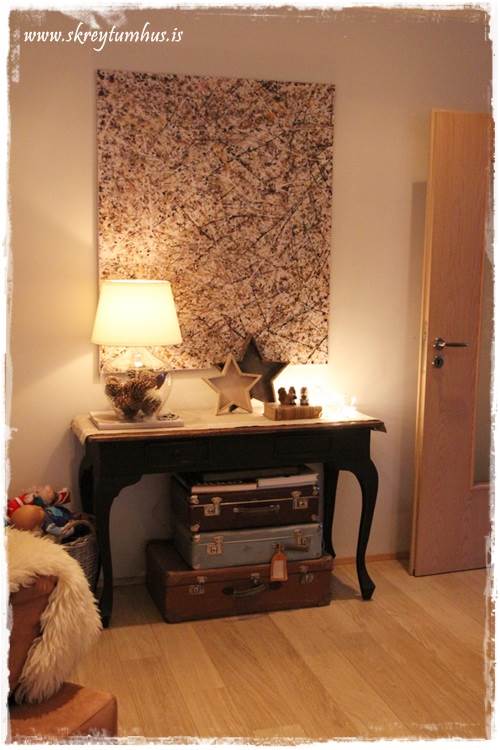 Hins vegar beini ég sjónum ykkar að hurðinni þarna á hvíta veggnum, þar hengdi ég upp eina coryllusgrein og skellti svona lafandi lengju þar ofan á – allt voða einfalt…