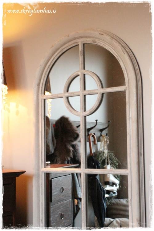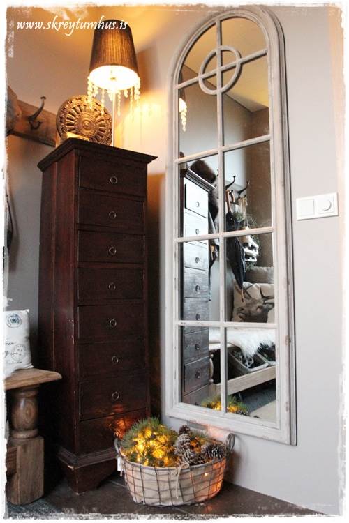 ..eins og sést í speglinum að þá er líka enn hreindýrapúðinn og skautarnir á bekknum – enda er það sko bara vetrarskraut og má vel vera áfram…