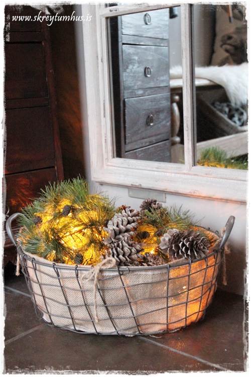 …á gólfinu er þessi vírkarfa sem er í miklu uppáhaldi hjá mér, og þessar ljósagreinikúlur og könglar, fá enn að vera á ganginum – þrátt fyrir desemberlok…