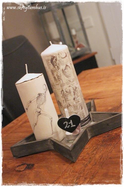 …og hér eru kertin aftan á, og eins og þið sjáið – þá brenndi ég aðeins brúnina á pappírinum á minna kertinu…