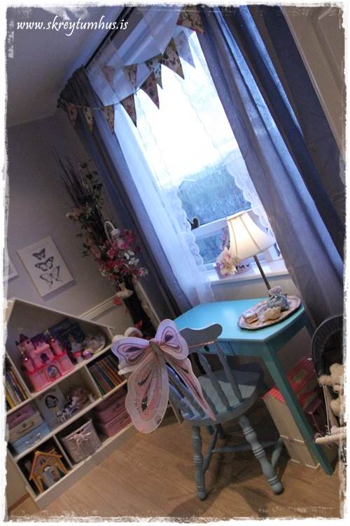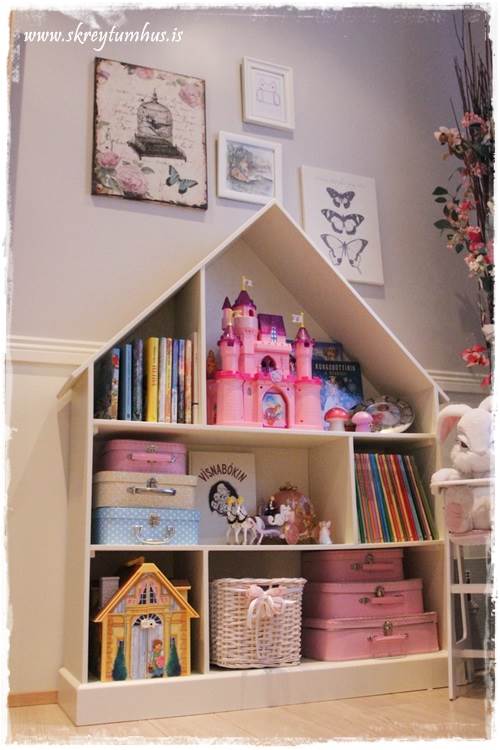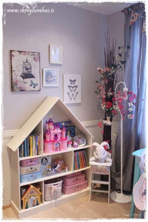 Finnst þetta æðislegt hjá þér og mig kítlar í fingurnar að gera e-ð svona hjá dömunni minni. En mætti ég spyrja, hvar fékkstu dúkkuhúsið (hillurnar) sem eru í herberginu, finnst þetta ægilega flott svona sem hillur? Og eitt annað, rammin þar sem stendur “við elskum þig til tunglsins…..” prentaðir þú þetta bara sjálf á svona flott mislit blöð? 🙂