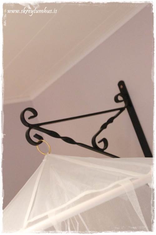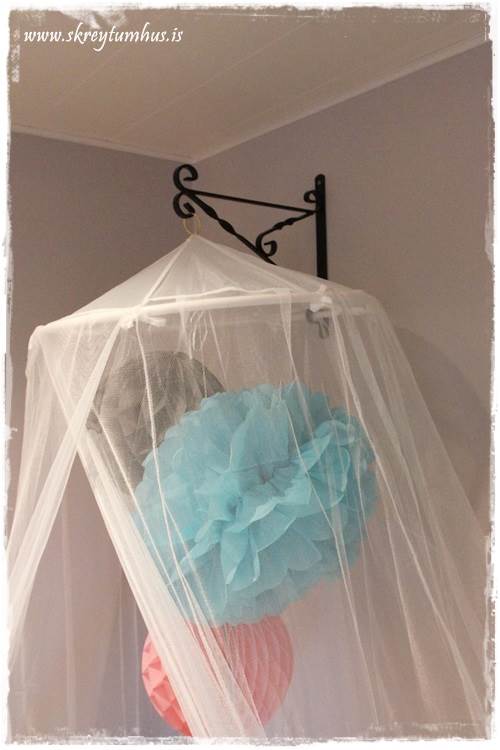 dúskarnir/pompoms voru líka keyptir í pappírshorninu í Ikea og eru til alveg sérlega fallegir litir af þeim, og alls konar stærðir.  Himnasængina þarf vart að kynna, en samt:  Má ég kynna þig fyrir henni Bryne!…