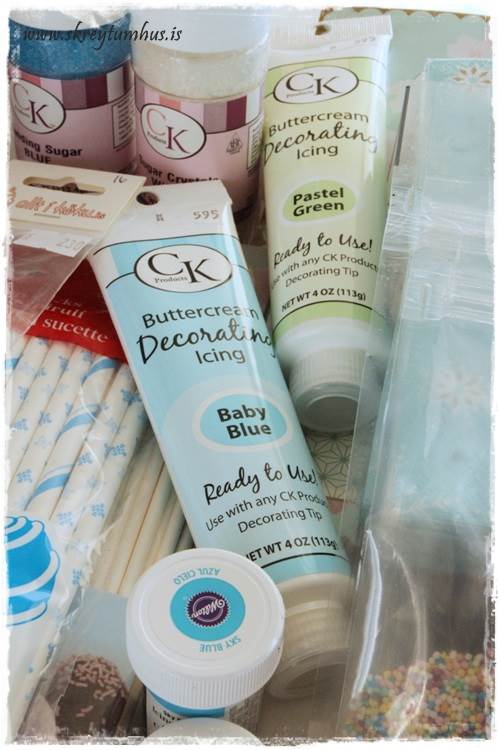 …í fyrsta sinn keypti ég smjörkrem í túpu, í réttum lit. Mjög þægilegt og handhægt. Síðan keypti ég bláa glitter stöffið, sem þið sjáið í vinstra horninu, og notaði það í Elsu-kökuna, ásamt hvítu/glæru glimmeri. Svo keypti í matarlit í réttum lit, í stað þess að reyna að “útbúa” rétta bláa tóninn…