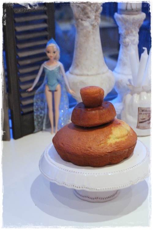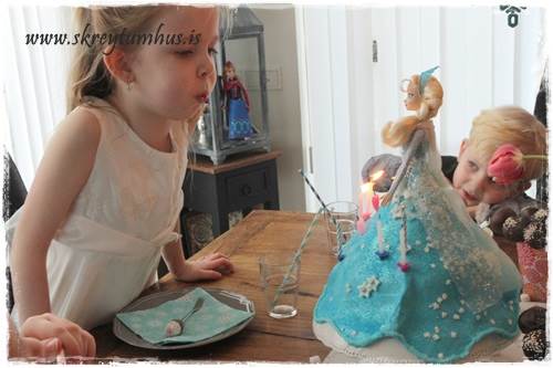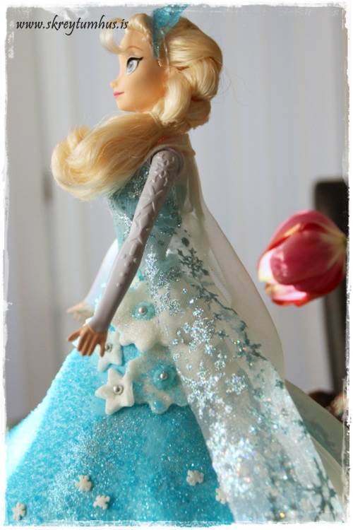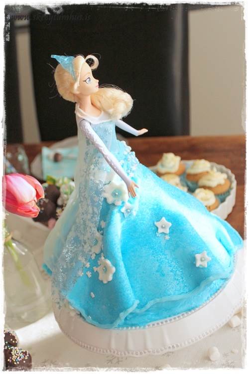 …úkoman varð síðan þessi, alls ekki pörfekt kökur og standa þannig að verið er að prufa að snúa sumum “rétt” og öðrum á “haus” bara til að kanna hvernig þetta raðaðist best. Einnig sést frú Elsa standa þarna á brókinni. En hún var síðan vafinn inn í vitawrap að neðan og plastpoka yfir eftir búk á meðan kakan var skreytt. Þið verðið bara að sjá smá svona Dexter-atriði fyrir ykkur í þessu 🙂