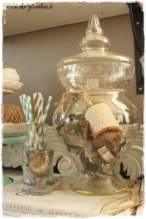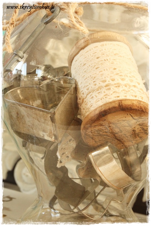 Ég er hrifin af glerkrukkum, sláandi og sjokkerandi fréttir fyrir ykkur sem lesið bloggið að staðaldri.  Hins vegar er erfiðara að finna hluti til þess að setja í krukkurnar svona þegar að vetri lýkur.  Ég hef notað mikið gerviepli, upprúllaðar blaðsíður og alls konar snæri og þess háttar.  En núna um daginn gerði ég smá uppgvötun.  Þannig er mál með vexti að mér finnast afsakaplega fallegir gamlir nytjahlutir, eins og gamli brúsinn í hillunni þarna.