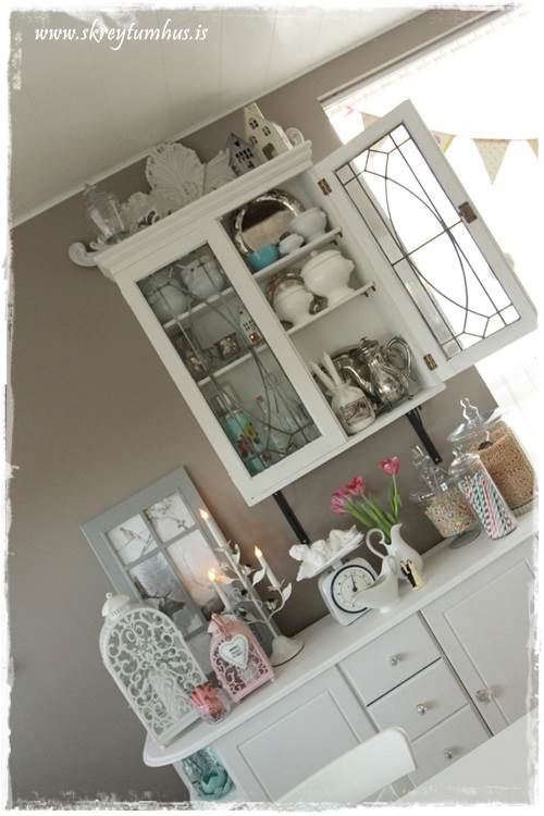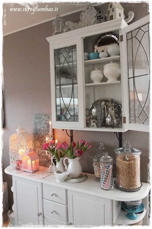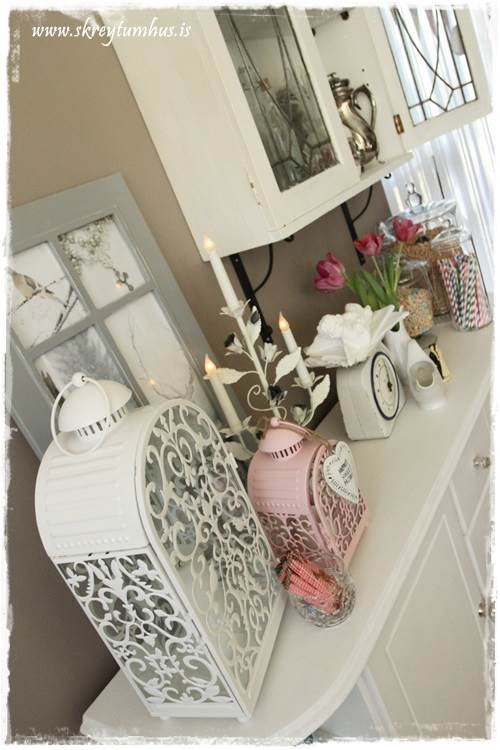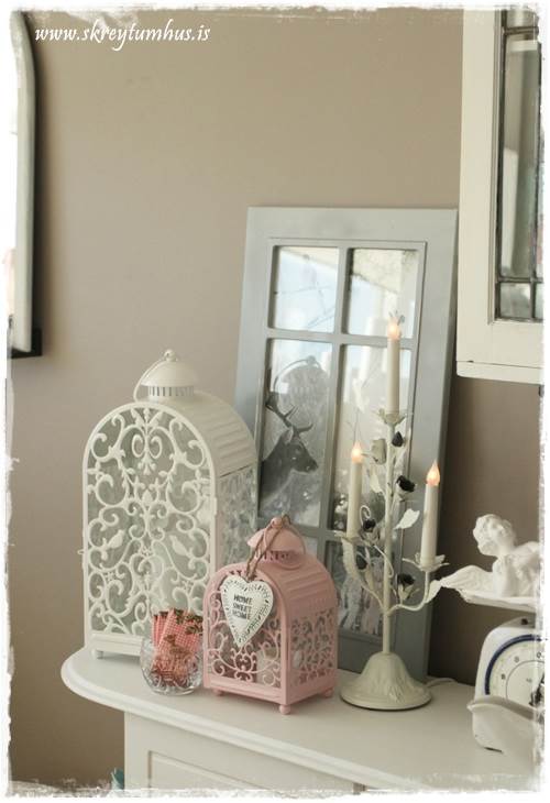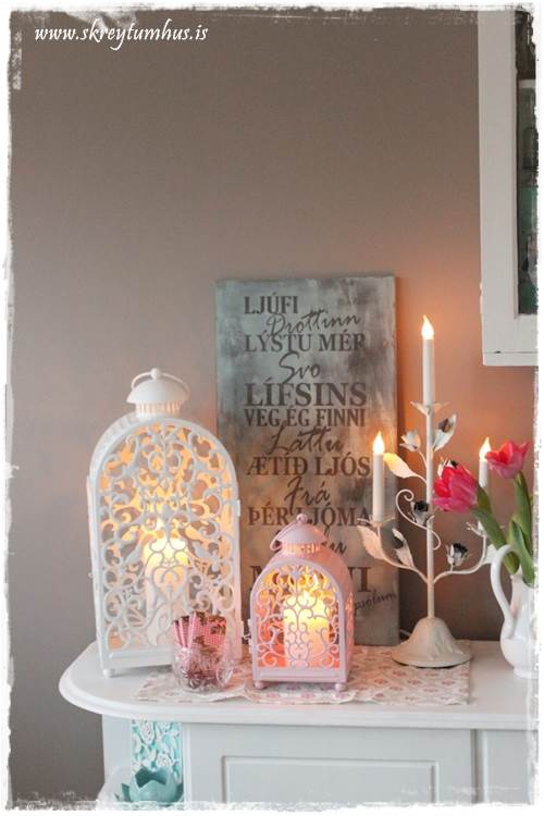 …ójá, þessar luktir voru bara of dásamlegar til þess að skilja eftir.  Reyndar er planið að nota þá minni inni í herbergi hjá dótturinni en maður minn, þær eru bara svo fallegar að ég ætla að njóta þess að hafa þær hérna saman inni í eldhúsi fyrst um sinn.  Þið sjáið líka skiltið sem ég bjó til á námskeiðinu hjá Fonts þarna á bakvið…