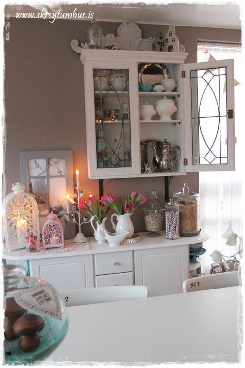 Mér finnst þetta æðislegt,ég er sjálf búin að reyna svo oft að hætta að vera með bleikt og blómamunstur heima hjá mér en það bara er ekki hægt það er svo rómó og fallegt!I luv it og er einmitt nýbúin að panta mér lukt og diskamottur svuntu og diskaþurrkur 🙂
