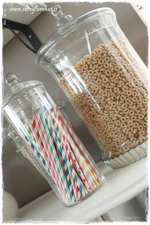 …fyrst ég var að “vora” til, þá ákvað ég að leyfa helgarmorgunkorninu að vera í glerkrukku, en það er svo skemmtilegir pastellitir og sumarlitir í því…