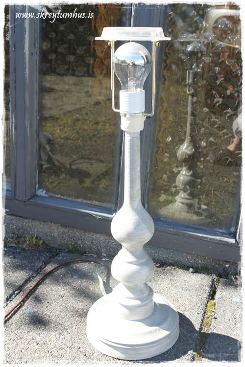 Þegar ég fer í þann Góða þá er ég alltaf með opin augun og kíki sérstaklega á lampana.  Sér í lagi ef þeir eru viðarlampar sem auðvelt væri að mála og breyta.  Fyrir þó nokkru síðan fann ég þannan hérna, hann var brúnn á lit og ég bara gleymdi að taka mynd af honum, eða ég finn hana ekki, sorry!!