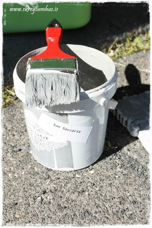 …og síðan málaði ég hann með kalkmálningu.  Eins og þið sjáið þá sést í grænt þarna í kring, en það er vegna þess að hann var málaður seinasta sumar og hefir staðið þægur og góður í bílskúrnum og beðið síns tíma…