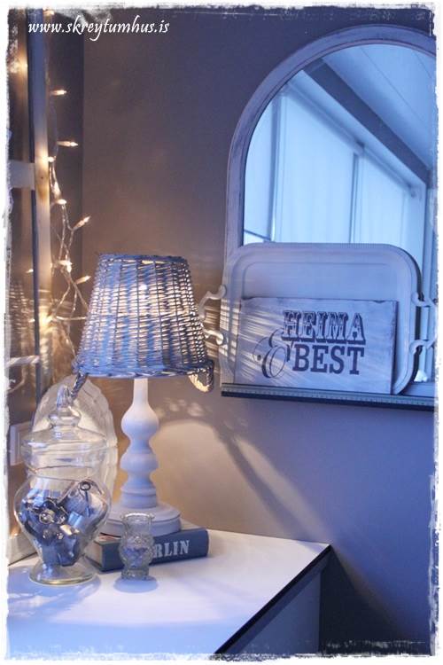…ég skellti síðan smá spegli á Ribba-hilluna á veggnum, og spreyjuðum hvítum bakka (fundur úr Góða og jamm, hann var spreyjaður þegar ég keypti hann).  Undir lampann setti ég síðan bók, og svo er bara sitt lítið af hverju þarna í kring…