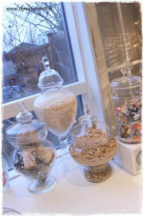 Stóra Cheerios-krukkan, á skenkinum, er frá Húsasmiðjunni. Sömuleiðis ein af hinum krukkunum, en svo eru tvær frá Aff.is 🙂