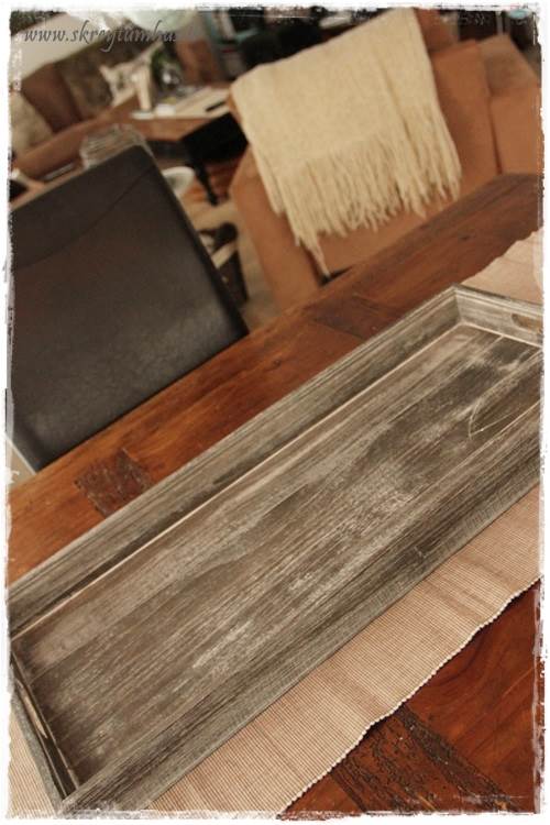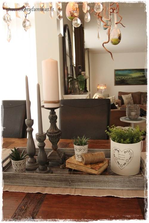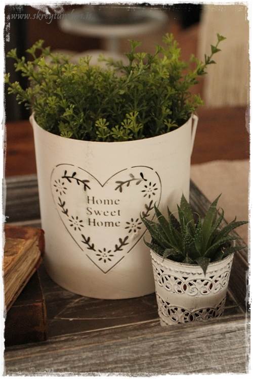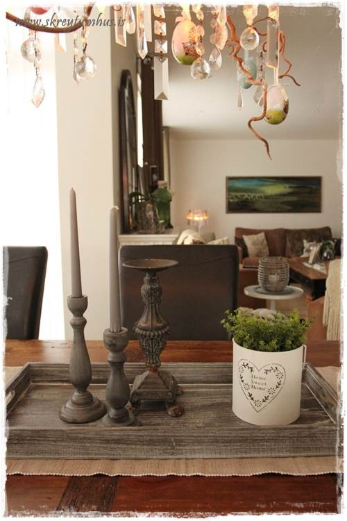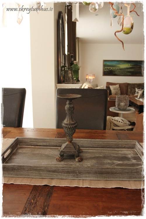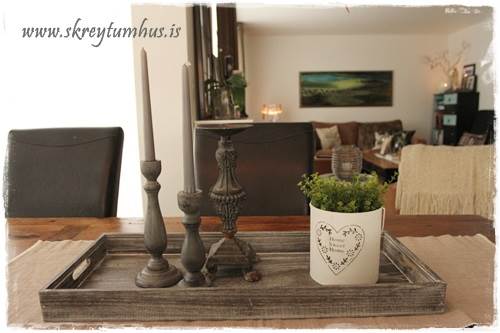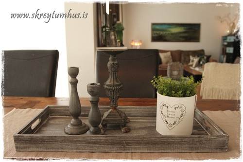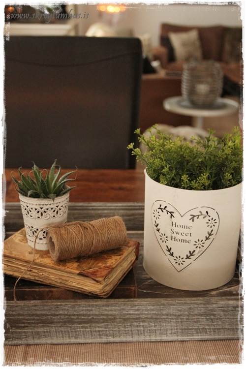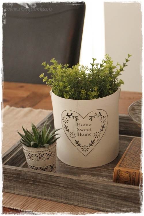 …eins og þið sjáið þá eru mjög flott Home Sweet Home-lukt komin á bakkann, nema að ég setti bara blóm ofan í hana.  Þetta er svona spurning um að hugsa út fyrir kassann og nota hlutina í öðrum tilgangi en þeim var ætlaður til að byrja með.  Hvíti liturinn er líka nauðsyn til þess að lýsa aðeins upp bakkann…