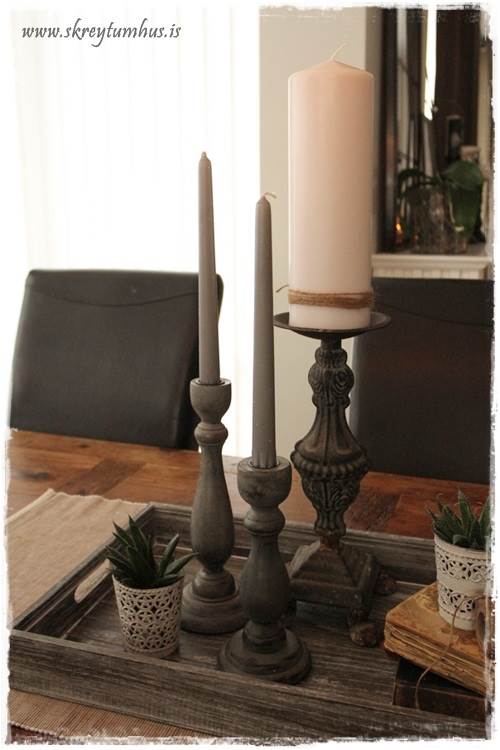 …eins og þið sjáið þá eru komnir 3 stjakar á bakkann, sem eru í mismunandi hæðum.  Það er eiginlega alveg nauðsynlegt að fá svona “tröppugang” í uppröðunina.  Ef þið eruð með stjaka í sömu hæð, þá má ná fram sömu áhrifum með því að setja mishá kerti í þá…