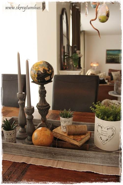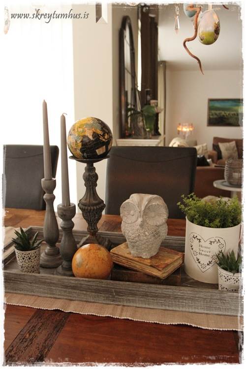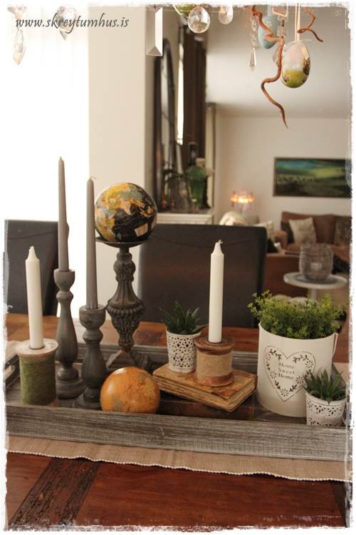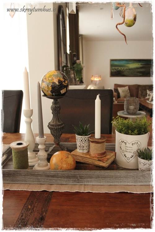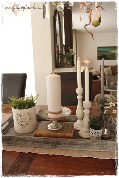 …það er líka góð þumalputtaregla að vera með fleiri hluti en bara kerti á bakkanum, eins og blóm eða styttu eða glerkúpul…