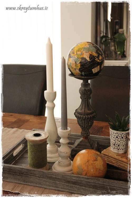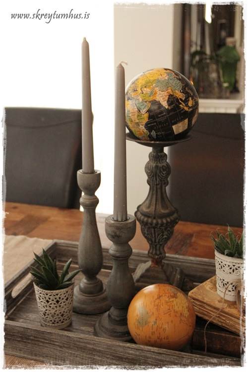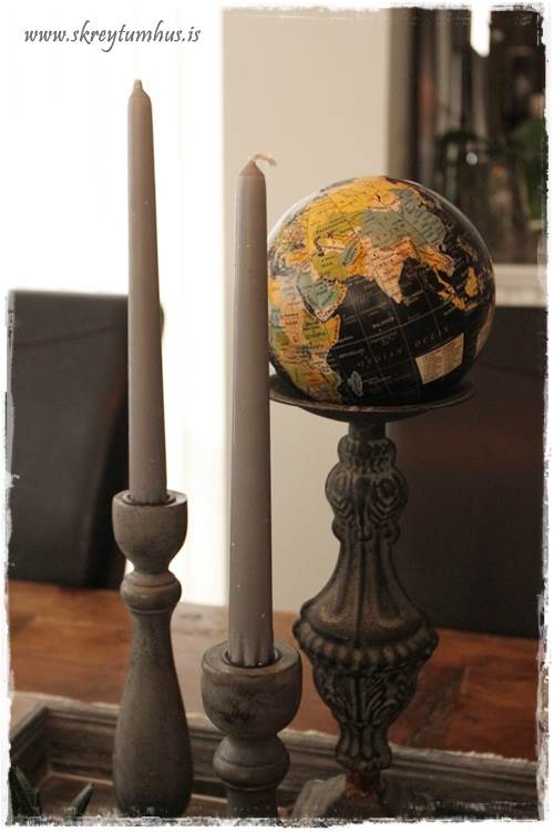…svo má nota kertastjakana fyrir annað en kerti, og hér hefur verið settur hnöttur á stóran stjakann í staðinn fyrir kerti…